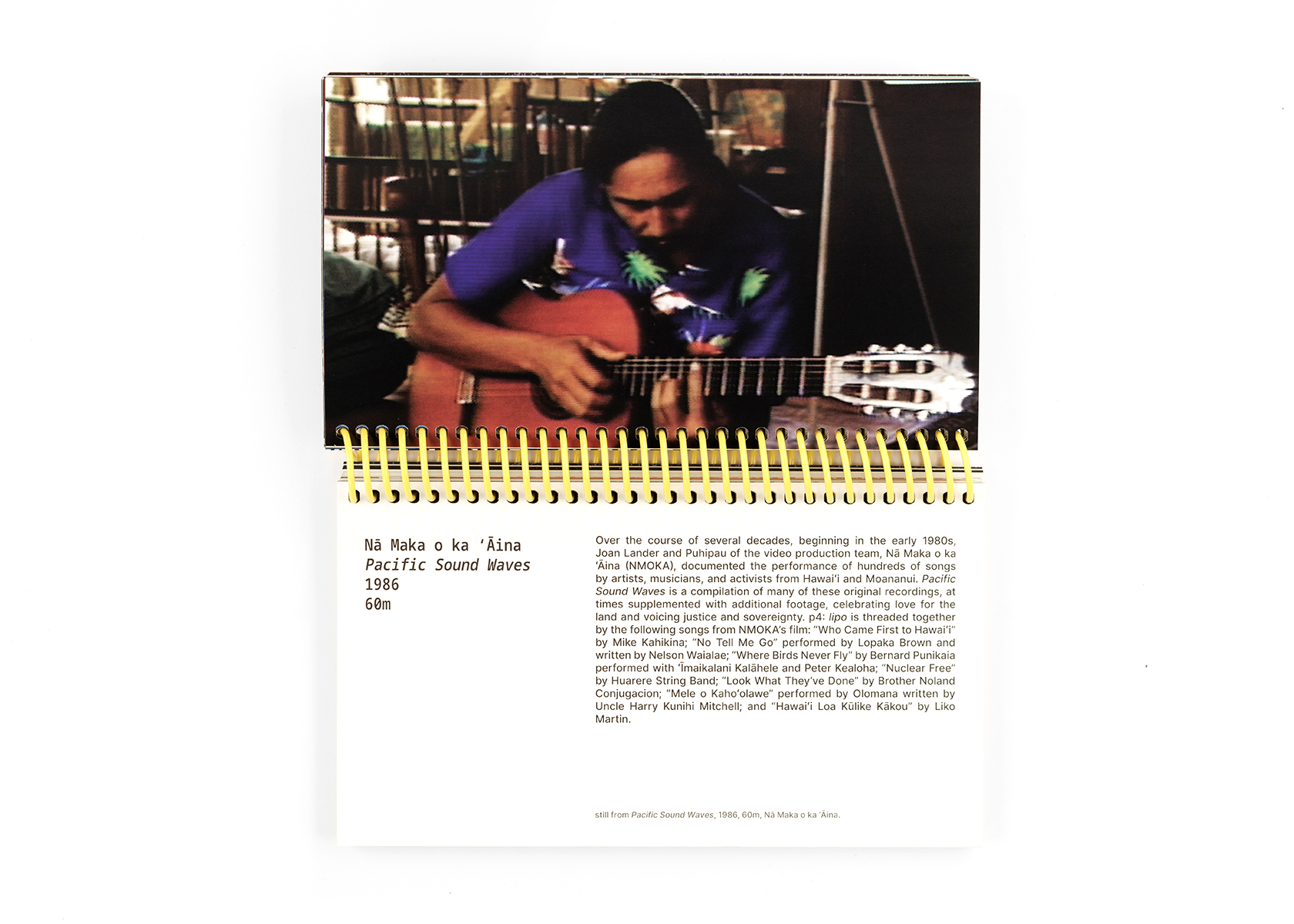 i nā kiʻi ma mua, nā kiʻi ma hope / images at front, images at back was an eight-part screening series curated, organized, and presented by kekahi wahi between 2022 and 2024 in Honolulu, New York City, Annandale-on-Hudson, Akita City (Japan), and Cologne (Germany). This publication expands documentation of the screening series through newly commissioned essays, roundtable discussions, reflections, poems, production notes, script excerpts, scores, short work descriptions, exhibition documentation and video stills.